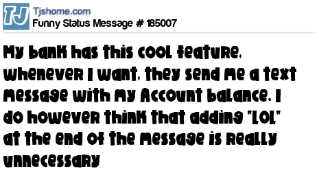 X says My bank has this cool feature, whenever I want, they send me a text message with my Account balance. I do however think that adding "LOL" at the end of the message is really unnecessary