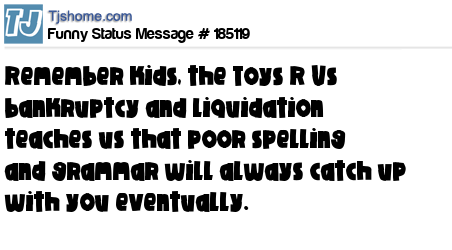 X says Remember kids, the Toys R Us bankruptcy and liquidation teaches us that poor spelling and grammar will always catch up with you eventually.