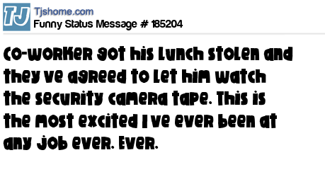 X says Co-worker got his lunch stolen and they’ve agreed to let him watch the security camera tape. This is the most excited I’ve ever been at any job ever. Ever.
