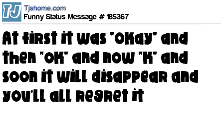 - # 127900 At first it was "Okay" and then "ok" and now "k" and soon it will disappear and you`ll all regret it .