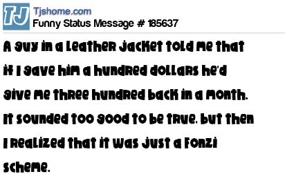 X says A guy in a leather jacket told me that if I gave him a hundred dollars he'd give me three hundred back in a month. It sounded too good to be true, but then I realized that it was just a Fonzi scheme.