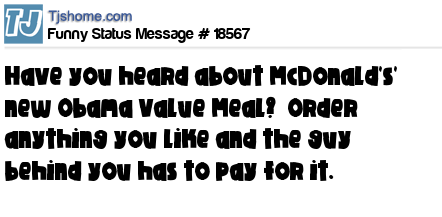 - # 29378 Have you heard about McDonald's' new Obama Value Meal? Order anything you like and the guy behind you has to pay for it.