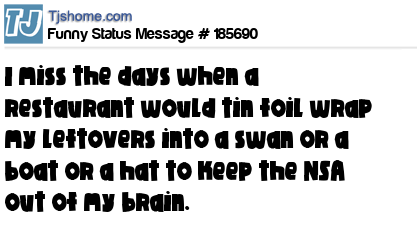 X says I miss the days when a restaurant would tin foil wrap my leftovers into a swan or a boat or a hat to keep the NSA out of my brain.