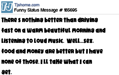 X says There’s nothing better than driving fast on a warm beautiful morning and listening to loud music. Well...sex, food and money are better but I have none of those. I’ll take what I can get.