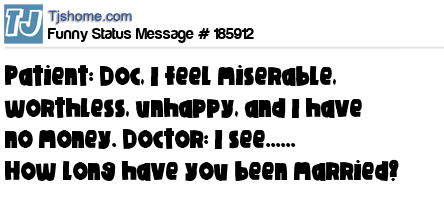 X is Patient: Doc, I feel miserable, worthless, unhappy, and I have no money. Doctor: I see...... How long have you been married?
