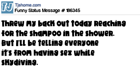 - # 196523 Threw my back out today reaching for the shampoo in the shower. But I'll be telling everyone it's from having sex while skydiving.