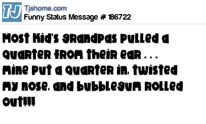 X says Most kid's grandpas pulled a quarter from their ear . . . mine put a quarter in, twisted my nose, and bubblegum rolled out!!!