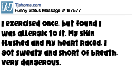 - # 65550 omg I just found out I'm allergic to exercise...at first I get all flushed, then I break out in a sweat, my heart starts pounding really fast, then I cant breath........i wont be doing that again!
