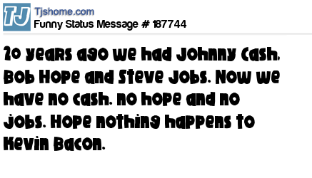 - # 122111 20 years ago we had Johnny Cash, Bob Hope and Steve Jobs. Now we have no cash, no hope and no jobs... Please don't let Kevin Bacon die.