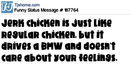 - # 196046 Jerk chicken is like regular chicken except he goes around with a backwards baseball cap and calls everyone "chief."