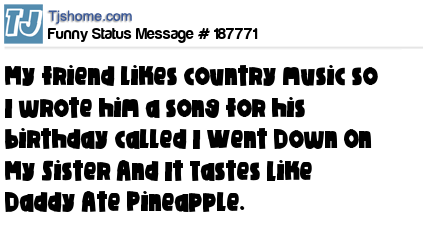 X says My friend likes country music so I wrote him a song for his birthday called I Went Down On My Sister And It Tastes Like Daddy Ate Pineapple.