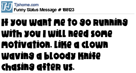 - # 48163 If you want me to go running with you, I'm going to need some motivation...Like a clown waving a bloody knife and chasing us.