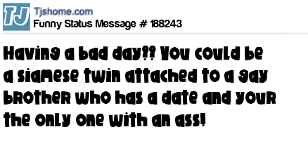 - # 172475 You think you're having a bad day, you could be a Siamese twin attached to a gay brother who has a date and you're the only one with an ass.