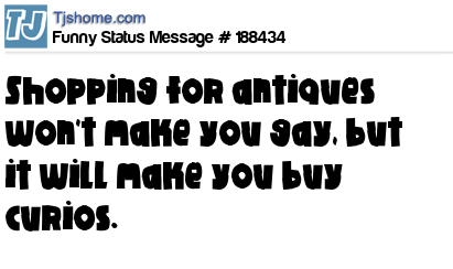 - # 104475 Shopping for antiques won't make you gay, but it will make you buy curios.
