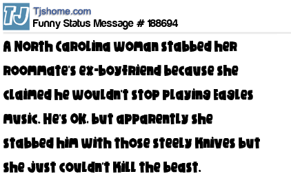 X says A North Carolina woman stabbed her roommate's ex-boyfriend because she claimed he wouldn't stop playing Eagles music. He's OK, but apparently she stabbed him with those steely knives but she just couldn't kill the beast.