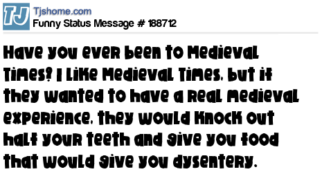 X says Have you ever been to Medieval Times? I like Medieval Times, but if they wanted to have a real medieval experience, they would knock out half your teeth and give you food that would give you dysentery.