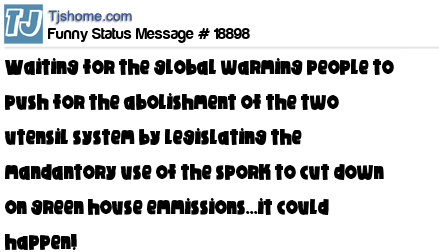 X is waiting for the global warming people to push for the abolishment of the two utensil system by legislating the mandantory use of the spork to cut down on green house emmissions...it could happen!