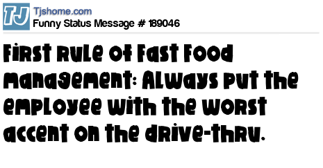 X says First rule of Fast Food management: Always put the employee with the worst accent on the drive-thru.