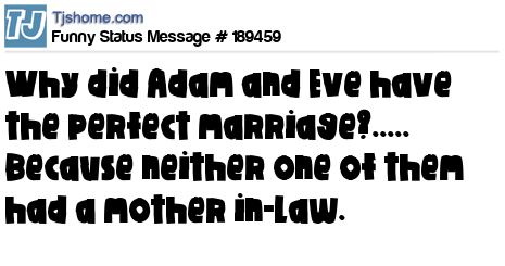 - # 121156 Adam and Eve had an ideal marriage. He didn't have to hear about all the men Eve could have married, and she didn't have to hear about how well Adam’s mother cooked.