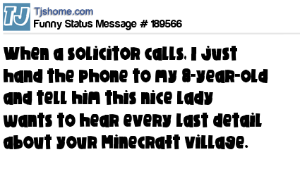 X says When a solicitor calls, I just hand the phone to my 8-year-old and tell him this nice lady wants to hear every last detail about your Minecraft village.