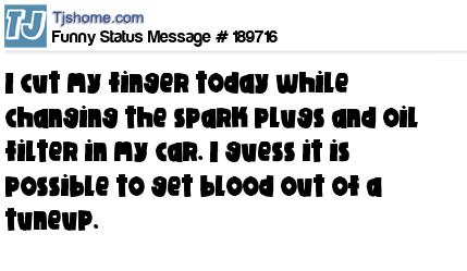 X says I cut my finger today while changing the spark plugs and oil filter in my car. I guess it is possible to get blood out of a tuneup.