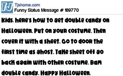 X is Kids, here's how to get double candy on Halloween. Put on your costume. Then cover it with a sheet. Go to door the first time as ghost. Take sheet off go back again with other costume. Bam double candy. Happy Halloween.
