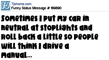 X says Sometimes I put my car in neutral at stoplights and roll back a little so people will think I drive a manual...