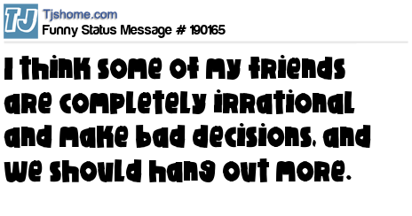 - # 192105 I think some of my Facebook friends make completely irrational decisions in life that make no sense whatsoever, and we should hangout more.