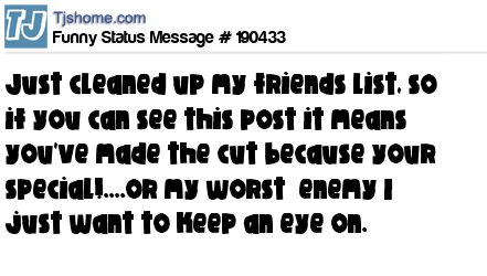 - # 191100 I just cleaned up my friends list. So if you could see this post it means you've made the cut because you're special! Or my worst enemy I just want to keep an eye on.