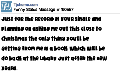 X is Just for the record: If your single and planning on asking me out this close to Christmas the only thing you'll be getting from me is a book, which will be do back at the libary just after the new years.