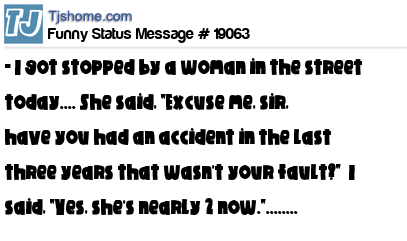 X - I got stopped by a woman in the street today.... She said, "Excuse me, sir, have you had an accident in the last three years that wasn't your fault?" I said, "Yes, she's nearly 2 now."........