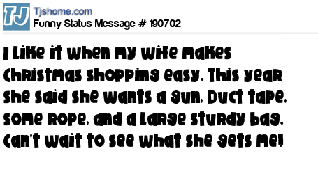 - # 204129 I like it when my wife makes Christmas shopping easy. This year she said she wants a gun, Duct tape, some rope, and a large sturdy bag. Can't wait to see what she gets me!