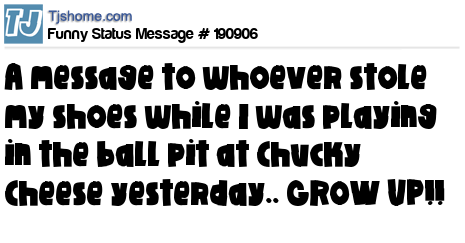 X says A message to whoever stole my shoes while I was playing in the ball pit at Chucky Cheese yesterday.. GROW UP!!