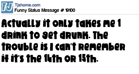 X Actually it only takes me 1 drink to get drunk. The trouble is I can't remember if it's the 14th or 15th.