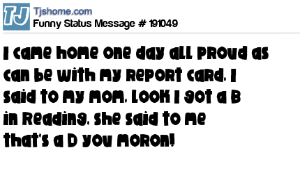 - # 192525 I came home one day all proud as can be with my report card and said to my Mom ,Look I got a B in reading , She said that's a D you moron!