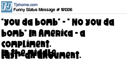 - # 157019 "You the bomb!" "No you the bomb!" -a complement in America; an argument in the Middle East.