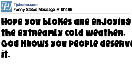 X is Hope you blokes are enjoying the extreamly cold weather. God knows you people deserve it.