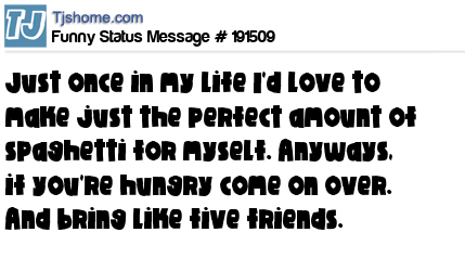 - # 192587 I don't know why but I always end up making just a little bit too much spaghetti for myself to eat. Anyways, if anyone's hungry come on over. And bring like five friends.