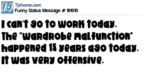 X  I can't go to work today. The "wardrobe malfunction" happened 15 years ago today. It was very offensive.