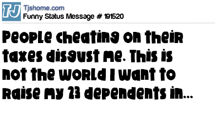 - # 208722 People who cheat on their taxes disgust me...this is not the world I want to raise my 32 dependents in! 😉