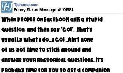 X says When people on Facebook ask a stupid question, and then say "Go!"...that's usually what I do...I GO!...Ain't none of us got time to stick around and answer your rhetorical questions..it's probaby time for you to get a companion pet.