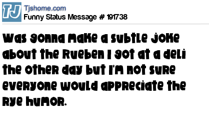 X says Was gonna make a subtle joke about the Rueben I got at a deli the other day but I'm not sure everyone would appreciate the rye humor.