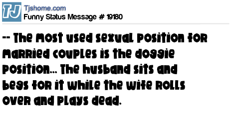 - # 13006 thinks the most used sexual position amoung married couples is doggy style, the husband sits and begs and the wife rolls over and plays dead.