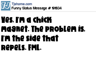 X says Yes, I'm a chick magnet. The problem is, I'm the side that repels. FML.