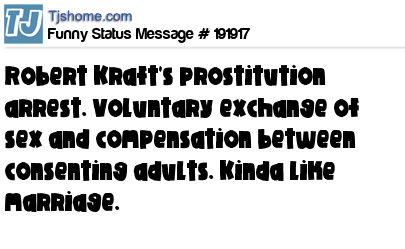 X Robert Kraft's prostitution arrest. Voluntary exchange of sex and compensation between consenting adults. Kinda like marriage.