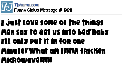 X says I just love some of the things men say to get us into bed"Baby I'll only put it in for one minute!"What am I?!?!A fricken microwave!?!!!