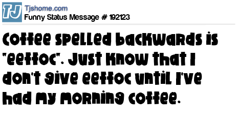 - # 192731 Did you know that coffee spelled backwards is eeffoc, which explains why I don't really give eeffoc about many thngs until I'm finish drinking it.
