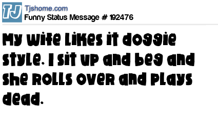 - # 188931 My wife and I have doggie style sex. I sit up and beg for it. And she rolls over and plays dead.