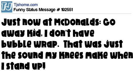 X says Just now at McDonalds: Go away kid, I don't have bubble wrap. That was just the sound my knees make when I stand up!
