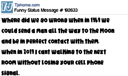 - # 193249 How come in 1969 we were able to send men all the way to the Moon and maintain perfect communication with them the whole time, while in 2019 I can't walk into the other room without losing a cell phone signal?